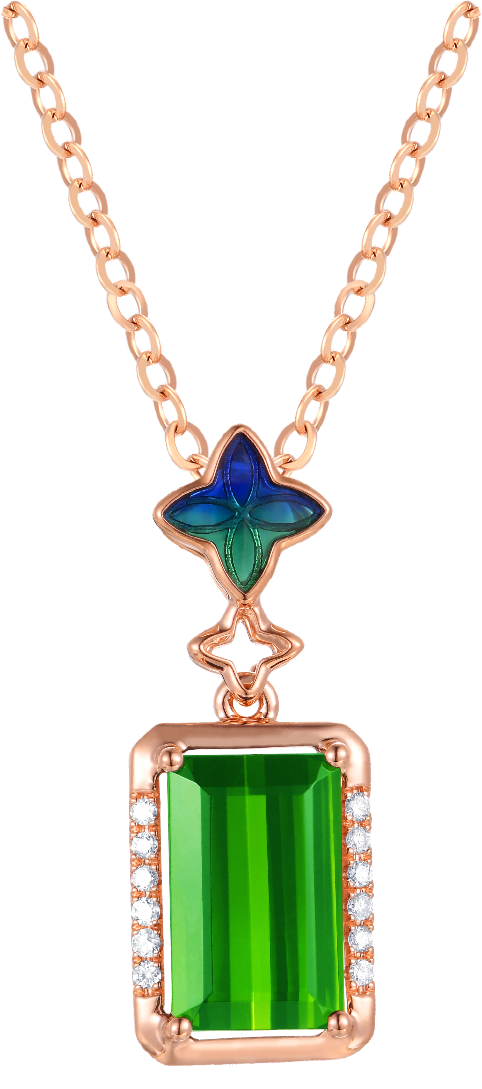 Crafted with 18K rose gold, the pendant base boasts a warm, lustrous glow that gently complements the skin, exuding a healing aura and showcasing refined elegance. The main stone is a 3.651ct natural tourmaline, vibrant and translucent, with a clear and full crystal structure. Each facet reflects a lively brilliance, as if capturing sunshine and laughter within; the pendant incorporates enamel craftsmanship and 0.13ct diamonds. The delicate warmth of the enamel and the subtle sparkle of the diamonds complement each other, creating a simple yet ingenious design that showcases meticulous craftsmanship in every detail.